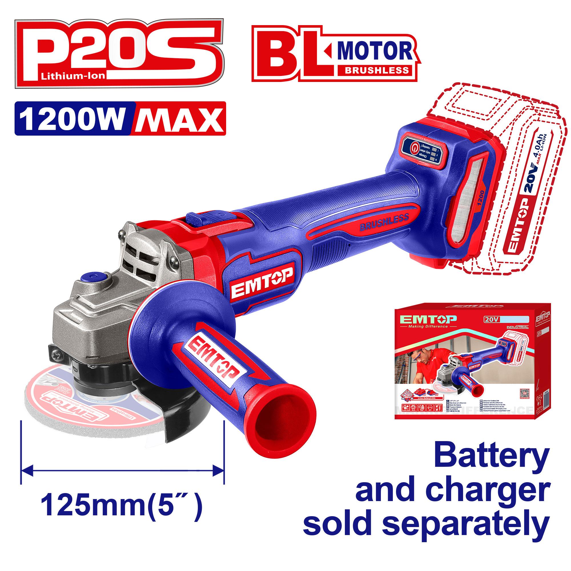 The EMTOP 20V Cordless Angle Grinder delivers exceptional power and versatility with a brushless 1200W motor and variable speed control up to 9000 RPM. Designed for precision cutting, grinding, and polishing, it’s built with a 125mm disc capacity, M14 spindle thread, and ergonomic grip for superior handling. Perfect for professionals and DIY users alike, this cordless grinder ensures mobility, safety, and long-lasting performance. Disc not included; battery and charger sold separately. Packed in a durable color box.