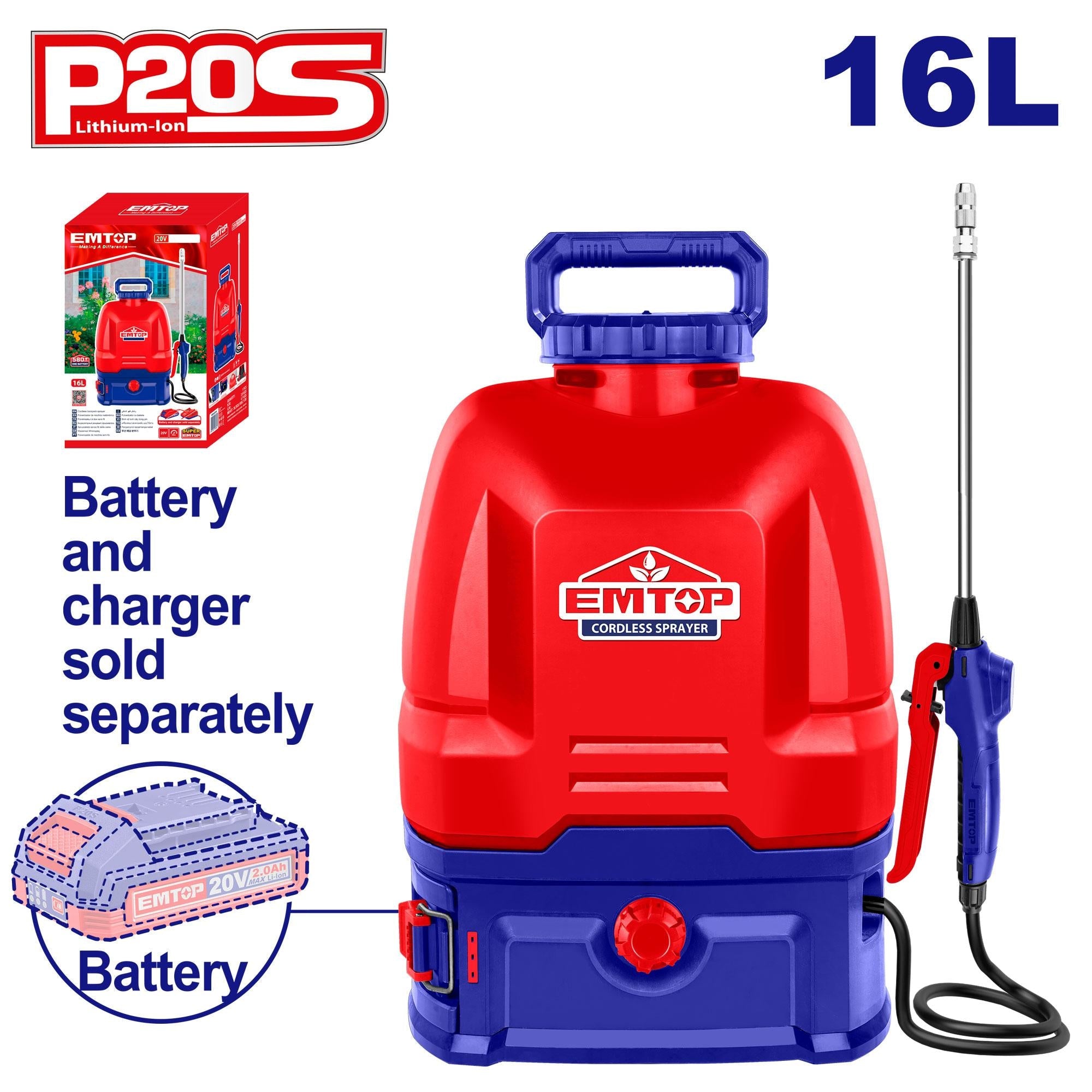 The EMTOP 20V Cordless 16L Battery Sprayer delivers efficient, portable spraying for gardens, farms, and cleaning applications. With 5 BAR pressure, 1.35L/min flow rate, and two-speed control, it ensures consistent and adjustable performance. Built with a PE tank, PP components, NBR seals, and a stainless-steel lance, it’s durable and chemical-resistant. The cordless design enhances mobility, while the large capacity and ergonomic trigger reduce fatigue during extended use. Battery and charger sold separately; packed in a sturdy color box.