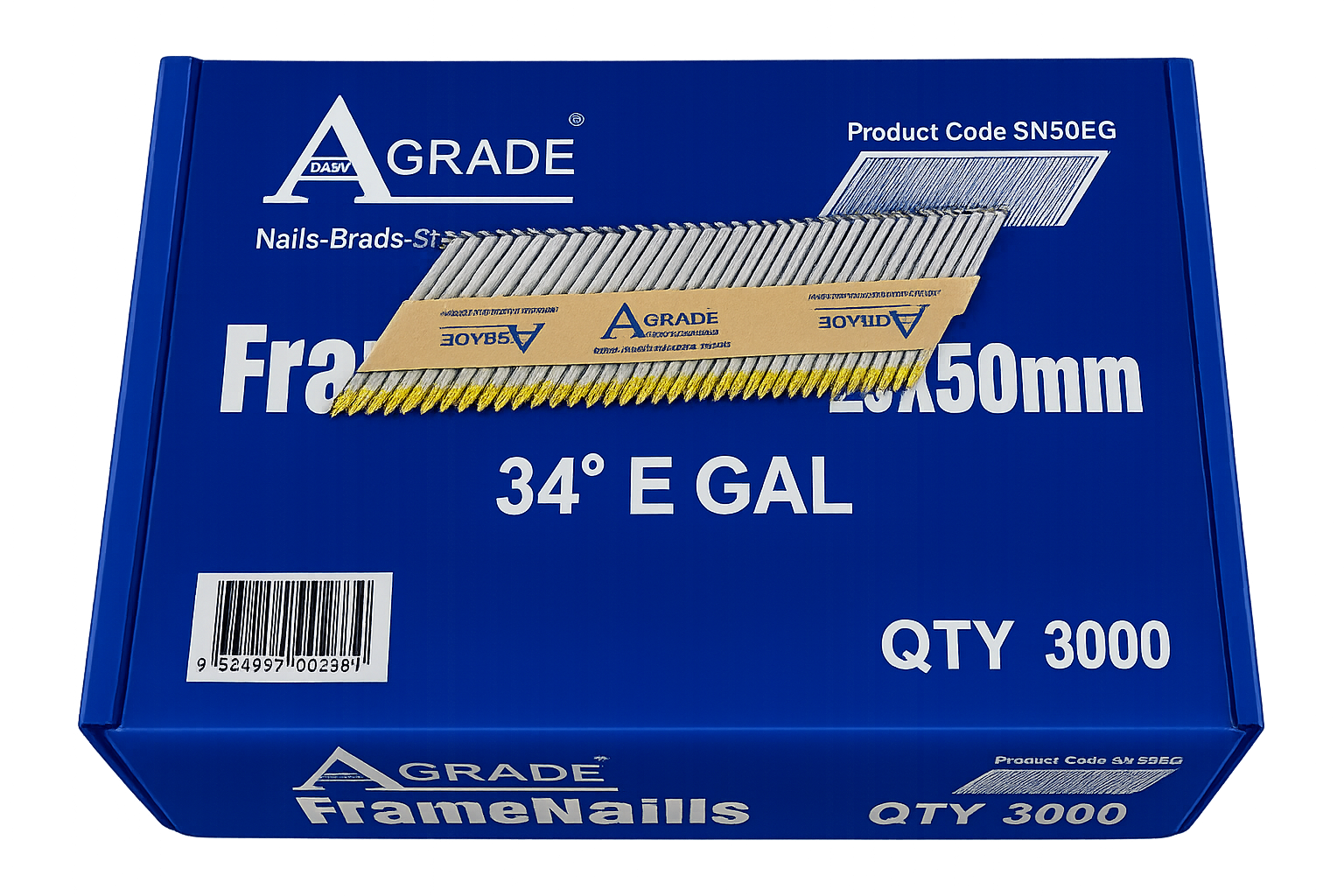 Framing Nail 2.9x50mm has a diameter of 2.9 millimetres and a length of 50 millimetres, specifically designed for use in framing construction. Framing nails are available in various lengths and gauges to accommodate different framing needs and materials. They are typically larger and more robust than nails used for finishing or trim work, as they need to provide strong and durable connections in the structural elements of a building.